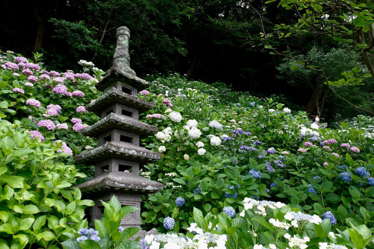 あじさい路は頂上付近でふた手に分かれます。下の道を進めばアジサイをバックにした石塔も撮影可能。あじさい路に咲くアジサイだけで約40種類あるので、色だけでなく花のつき方を見比べるだけでもあっという間に時間が過ぎてしまうでしょう。