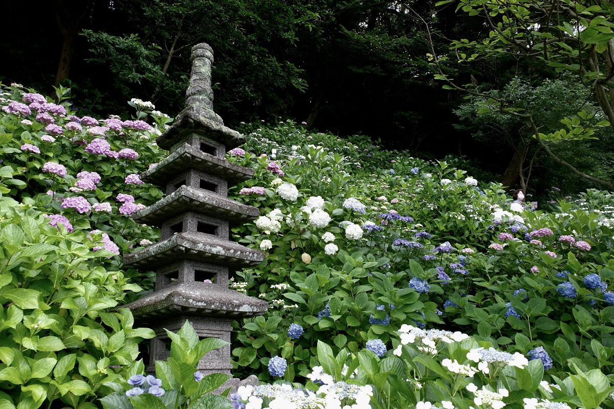 下の道を進めばあじさいをバックにした石塔など、古刹らしい厳かな写真も撮影可能です。