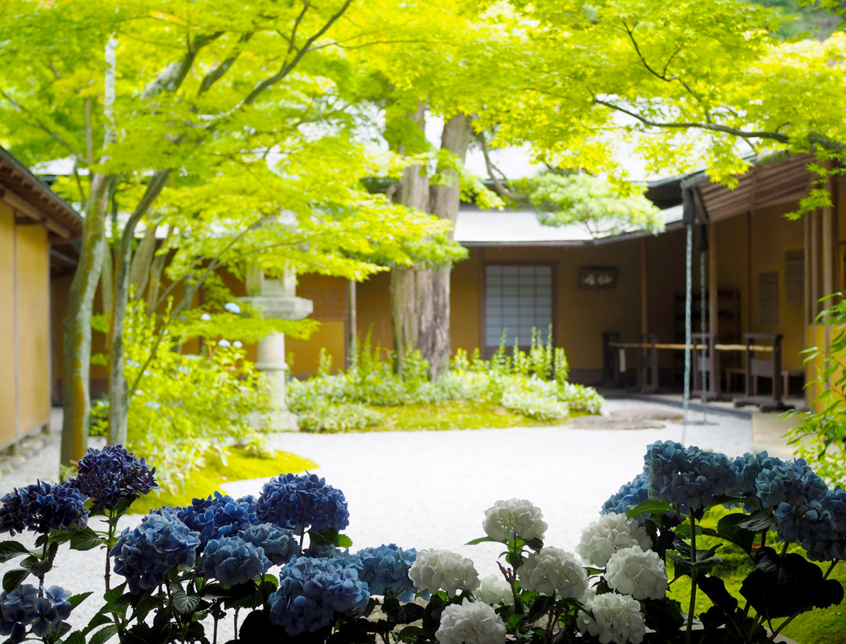 「報国寺」のあじさいは、数こそ多くはありませんが、石塔やお地蔵様の近く、美しく整えられた竹林に、青、紫のあじさいが映え、厳かな古刹らしい風情のある景色を堪能することができます。本堂横の受付で「拝観券」400円と一緒に「抹茶券(干菓子付き)」600円を購入すると、竹林と向き合いながらお抹茶をいただける「茶席 休耕庵」を利用することも。お抹茶を味わいながら、優雅なひとときを。
