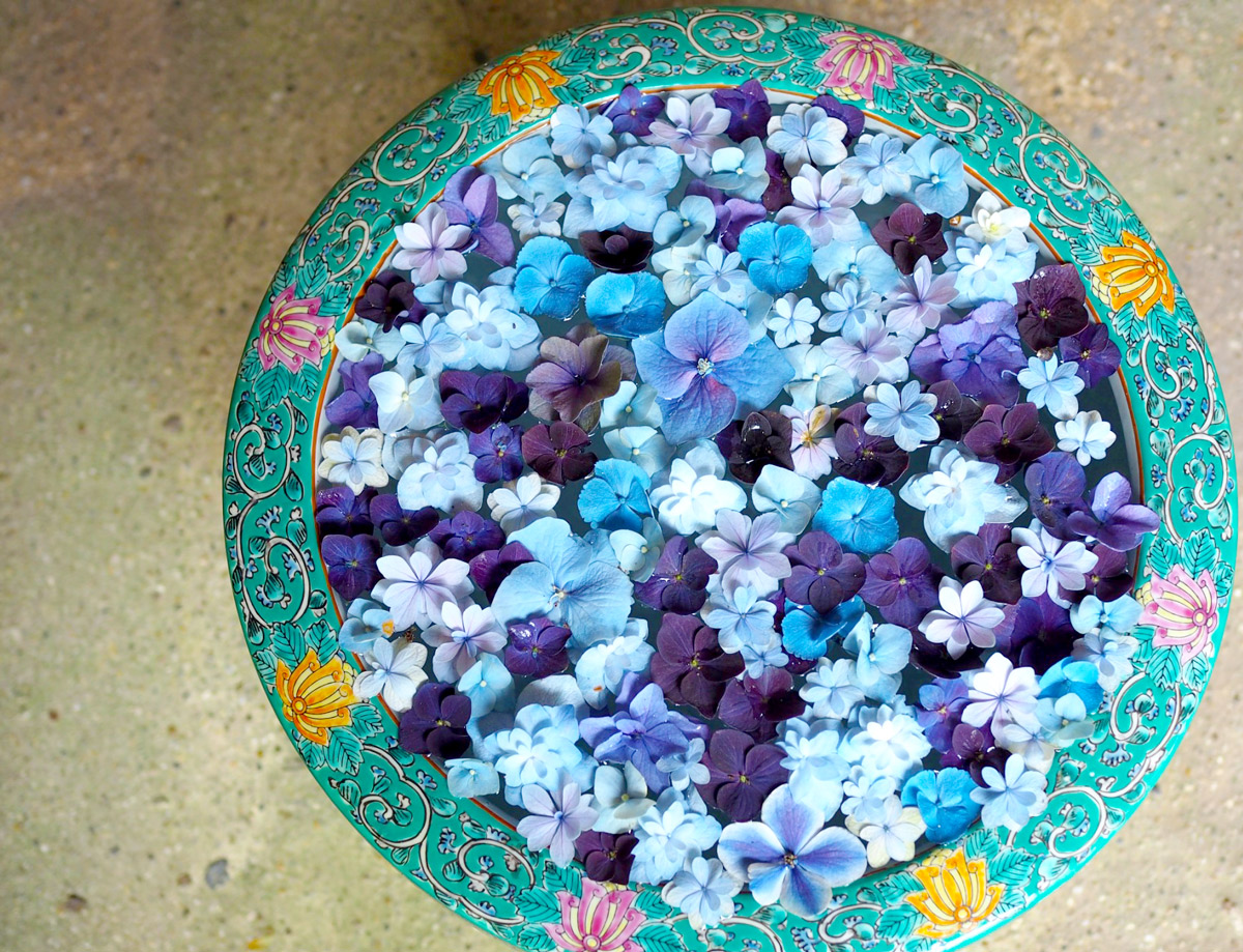 あじさいの季節には、庭園各所にあじさいの花を浮かべた花手水が設えられて、思わず写真に収めたくなるようなフォトジェニックなスポットに。この季節ならではの風情が楽しめます。