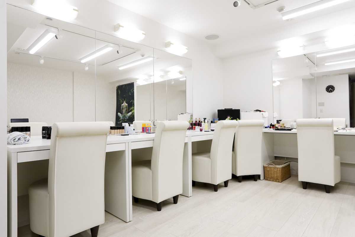 レッスンは、白を基調としたクリーンな印象のメイクルームで行います。カウンターには使用するスキンケアやコスメ、メイクツールがズラリ。