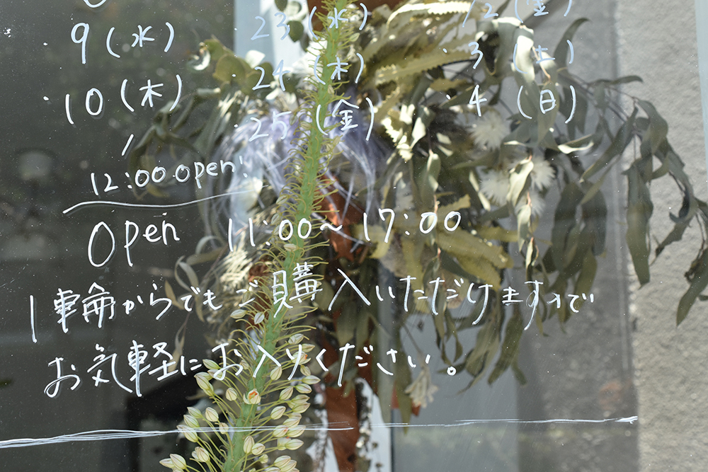 お店はオーダーフラワーのアトリエも兼ねているので、オープン日が限られています。公式インスタグラム(@_ish.shino)でオープン日を必ずチェックしてから訪れてくださいね。
