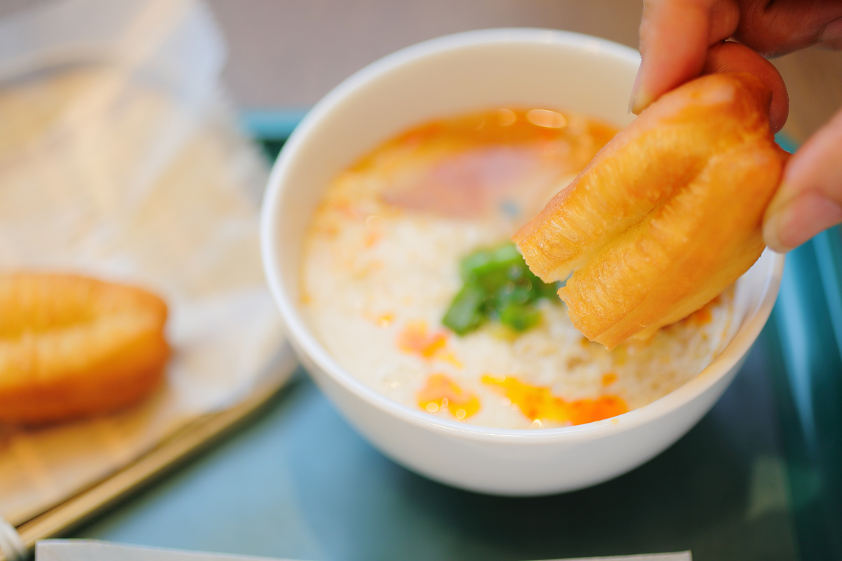 甘くない揚げパン「油條(ヨーテァオ)」120円を浸していただくのが台湾流です。