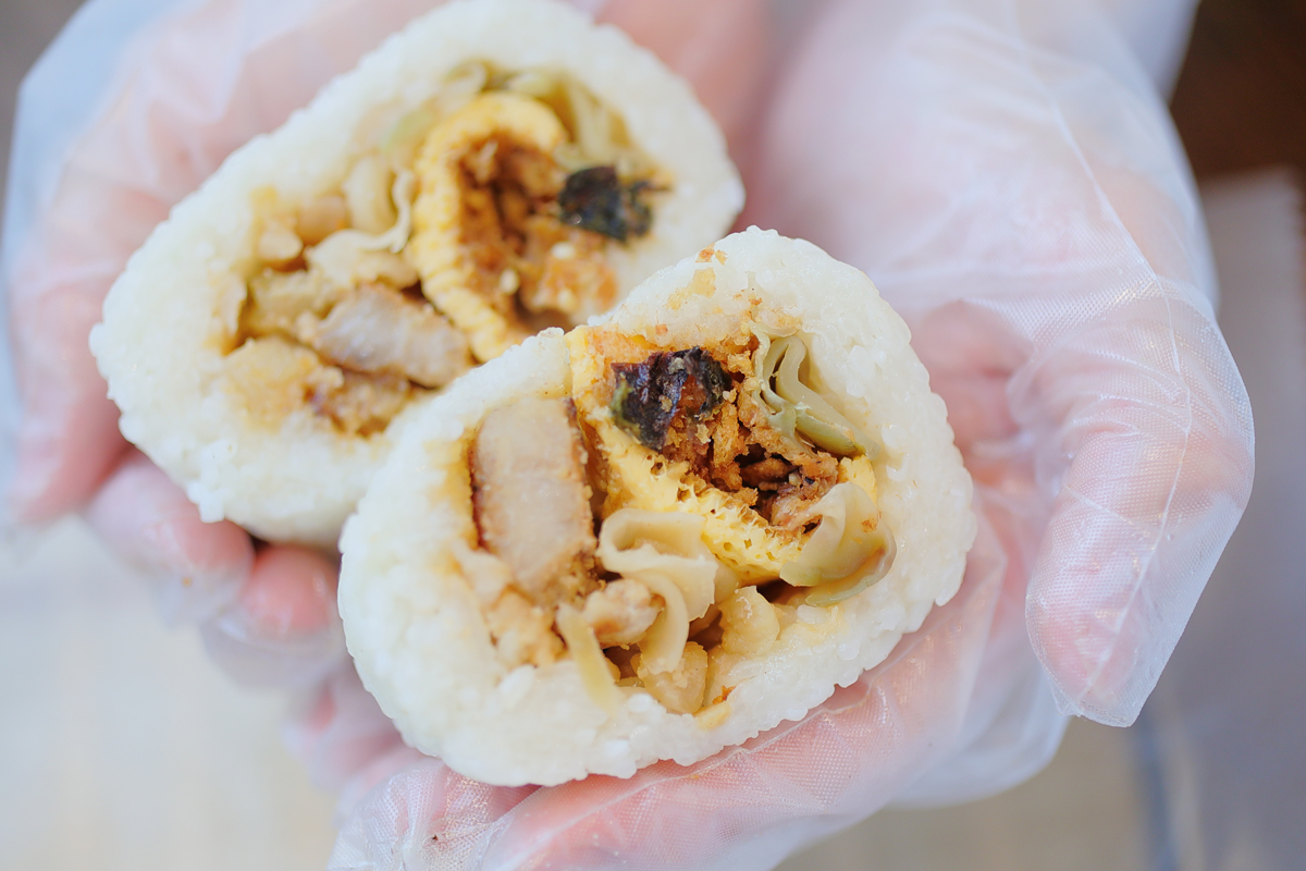 真っ白で大きい俵型が目を引くおにぎり!こちらは台湾式おにぎりの「招牌飯糰(ジャオパイファントゥアン)」。モッチモチのもち米の中身は…