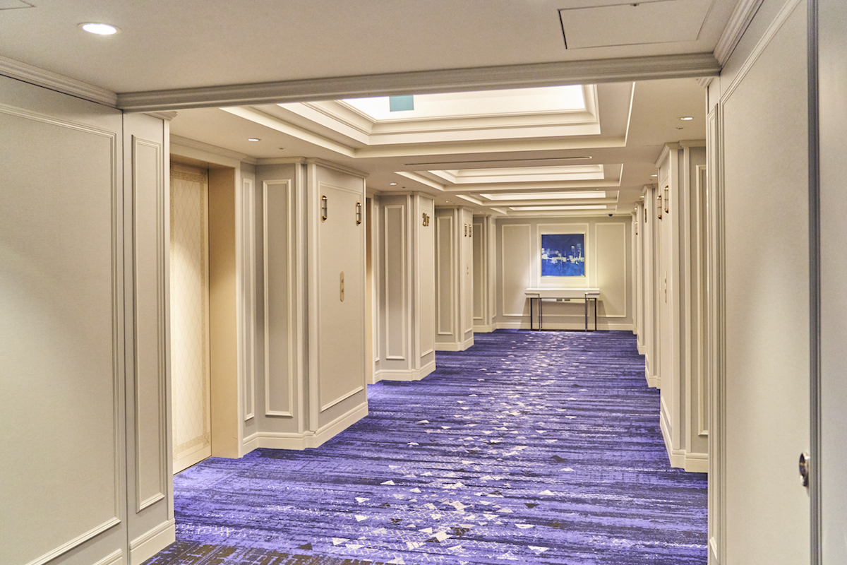 いよいよ、客室へ!「グランドニッコー東京 台場」では、専用ラウンジを利用できるエグゼクティブフロア(25~28階)、レインボーブリッジや大井ふ頭を望むベイビューフロア(20~24階)、ビジネスユースにも最適なレギュラーフロア(6~19階)があります。フロアタイプごとにエレベーターホールのカラーが異なるので、フロアを間違える心配がなく安心です。
