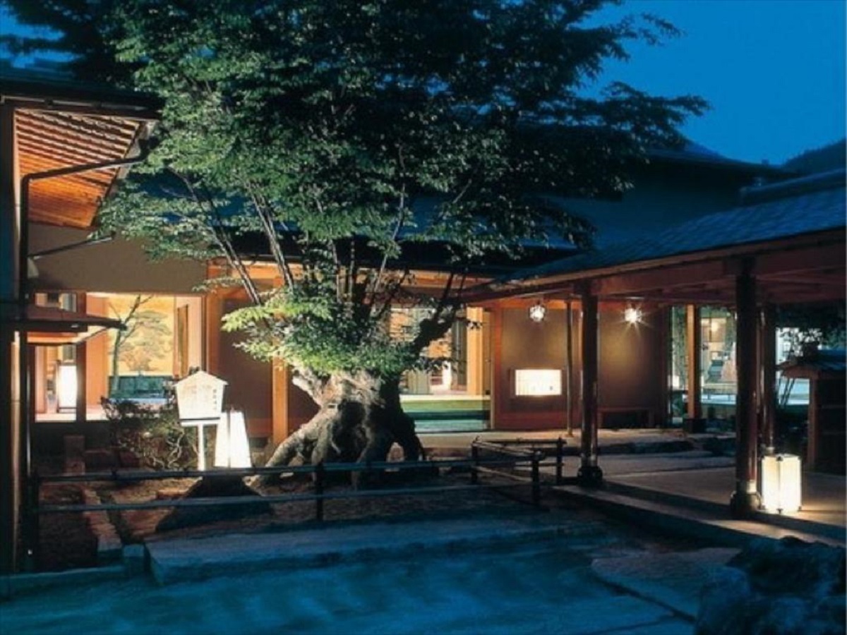 万葉集、源氏物語に登場する山深い里に、平屋建て数寄屋造り、茅葺きの茶室、巨石の露天風呂、総桧造りの能舞台など日本情緒を表現しています。