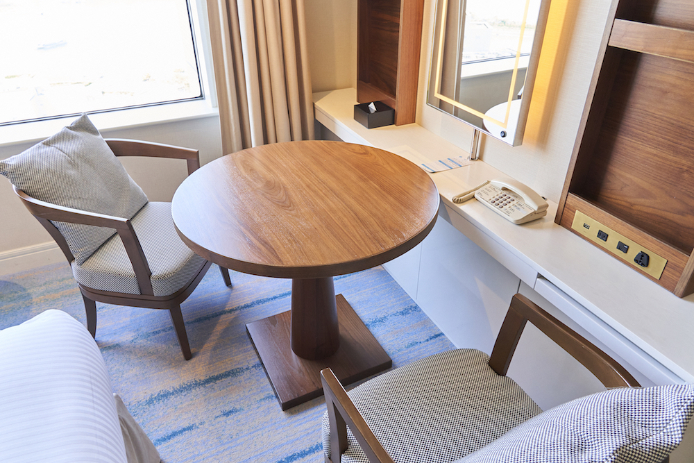 客室にもデスクコーナーがあり、こちらもすぐ近くに電源とUSBポートがあるので安心ですね。もちろん、客室でも無料Wi-Fiを使って仕事ができます。