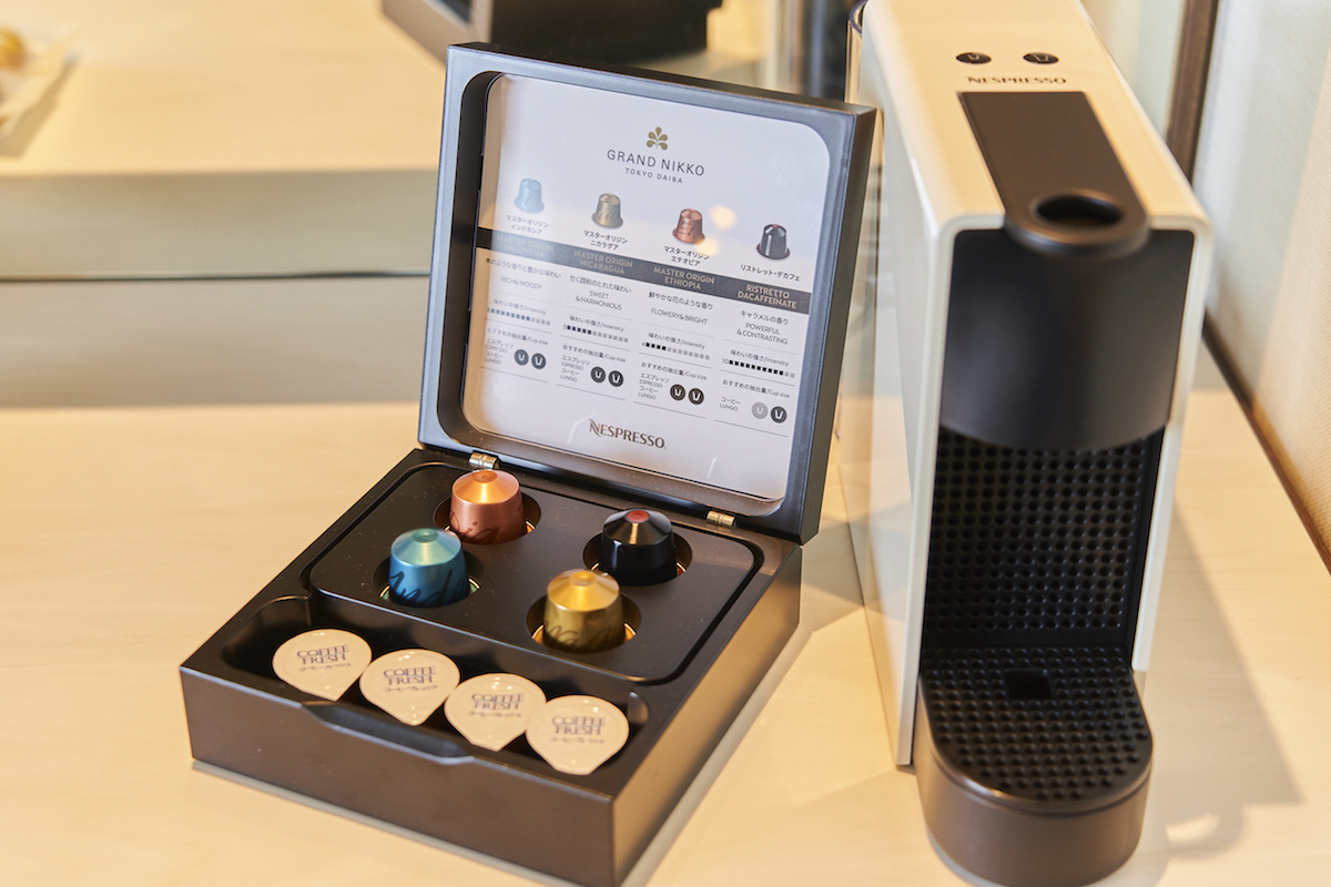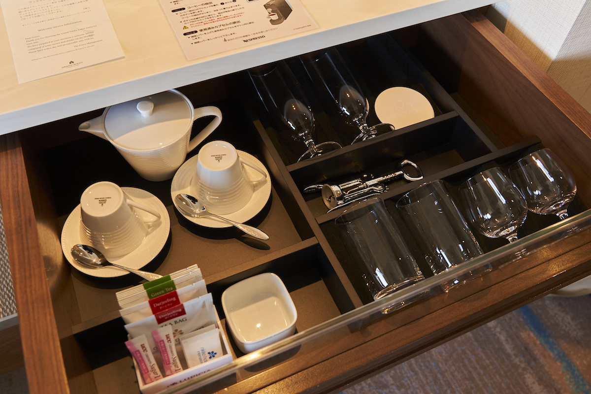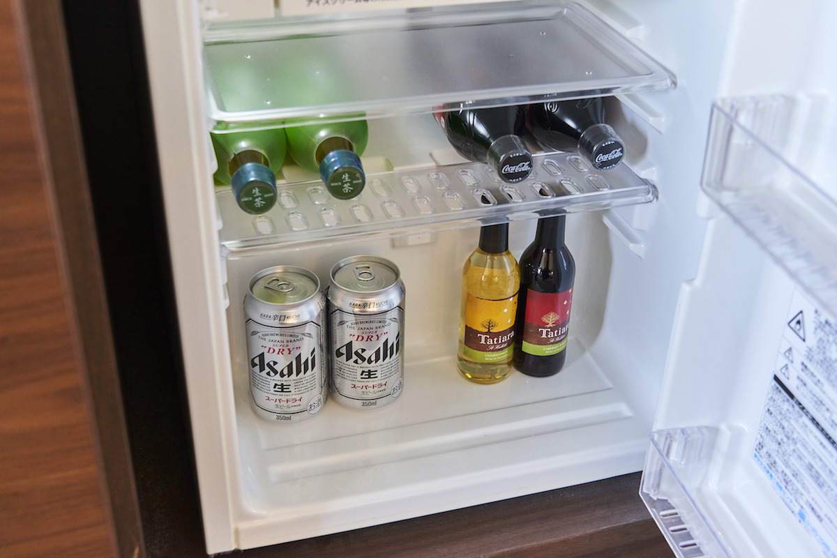 客室にも、無料のコーヒーマシーンや紅茶、緑茶、ミネラルウォーターがあるので、水分補給やリフレッシュに活用しましょう。さらに、エグゼクティブフロアの客室のみ冷蔵庫にドリンクやアルコールが用意されていて、もちろんすべて無料。新型コロナウィルス感染拡大防止のため、館内レストランでのアルコール提供がNGでも、客室ならばいただけます。仕事終わりの一杯を楽しみに、頑張りましょう!