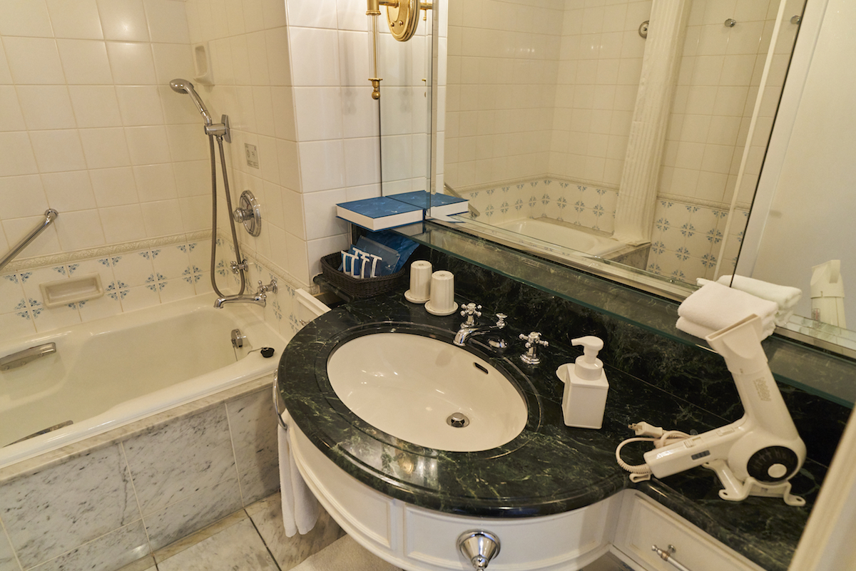バスルームもチェック!「グランドニッコー東京 台場」は全室バスタブ付きなので、仕事で疲れた頭と体を湯船につかって癒やせます。シャンプー・コンディショナー・ボディソープ、メイク落とし、化粧水、乳液とひと通りのアメニティは揃っているので、荷物は少なめでOKですよ。