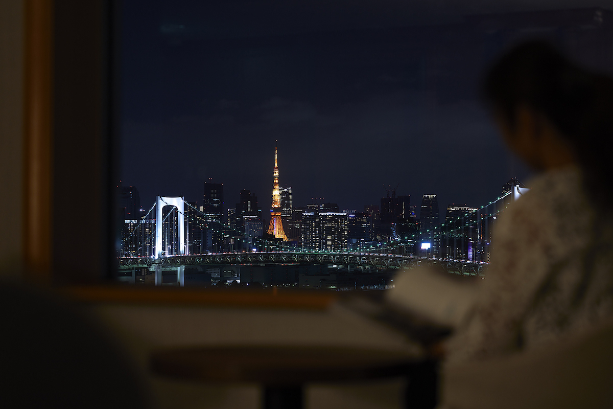 どの窓からもレインボーブリッジと東京タワーが見え、非日常空間を楽しめます。ここから眺めると、遠近感の作用で東京タワーと東京スカイツリー®が同じ高さに見えるんです!ぜひ実際に、この27階のラウンジから眺めてみてくださいね。
