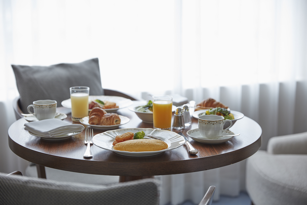 翌朝は、前日にルームサービスへと変更しておいた朝食を客室でいただきます。しかも、ナイトウエアのまま、ノーメイクで。和食・洋食から選べ、客室に持ってきてもらえるなんて、このうえない贅沢。仕事を頑張った自分への“ご褒美”といったところでしょうか。朝食は、館内のレストラン数カ所、またはルームサービスを選べます。