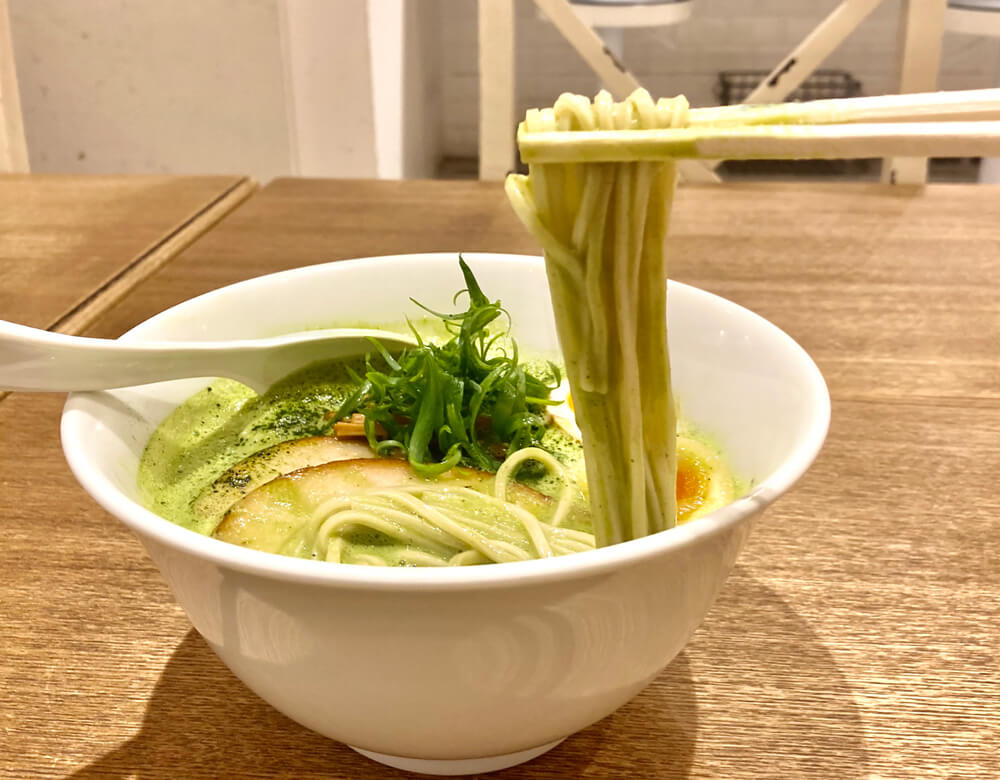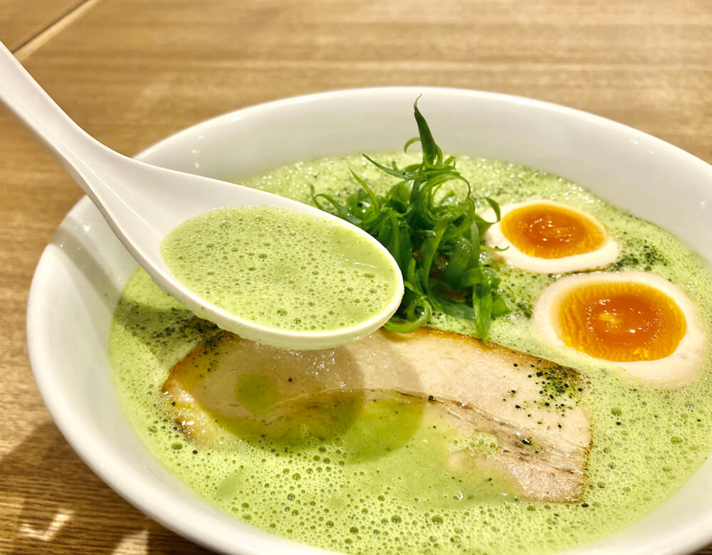 見た目からは味が想像できない!グリーンのふわふわスープの「抹茶鶏白湯らぁめん」