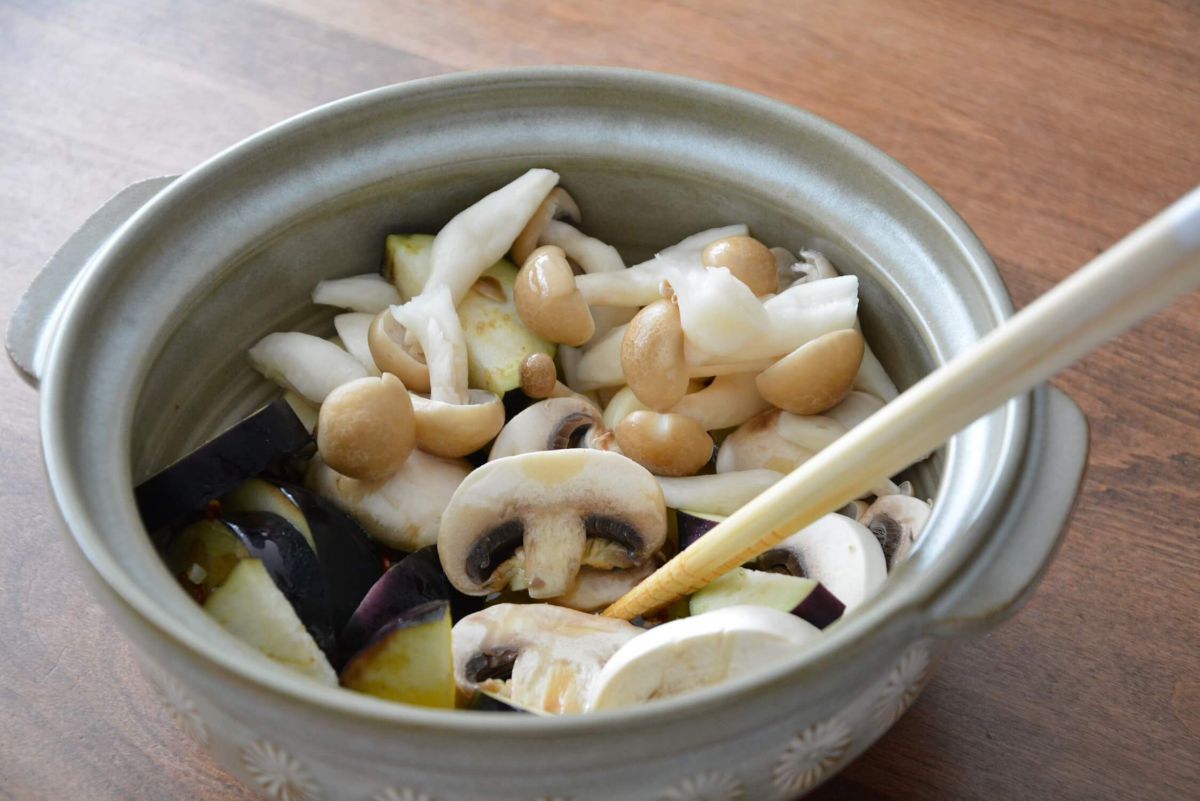 ニンニクの香りが出てきたらひと口大に切ったナス、マッシュルーム、シメジ、ニンニクを入れ中火に。