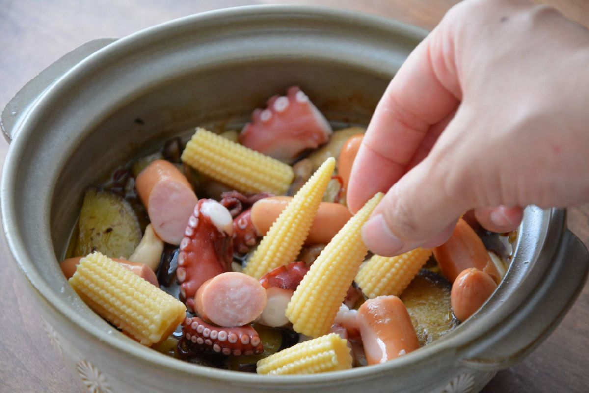 ナスが軟らかくなったらタコ、エビ、ウィンナー、パプリカ、ヤングコーン、長イモ、ブロッコリーを入れます。塩・コショウで味を調えて完成!