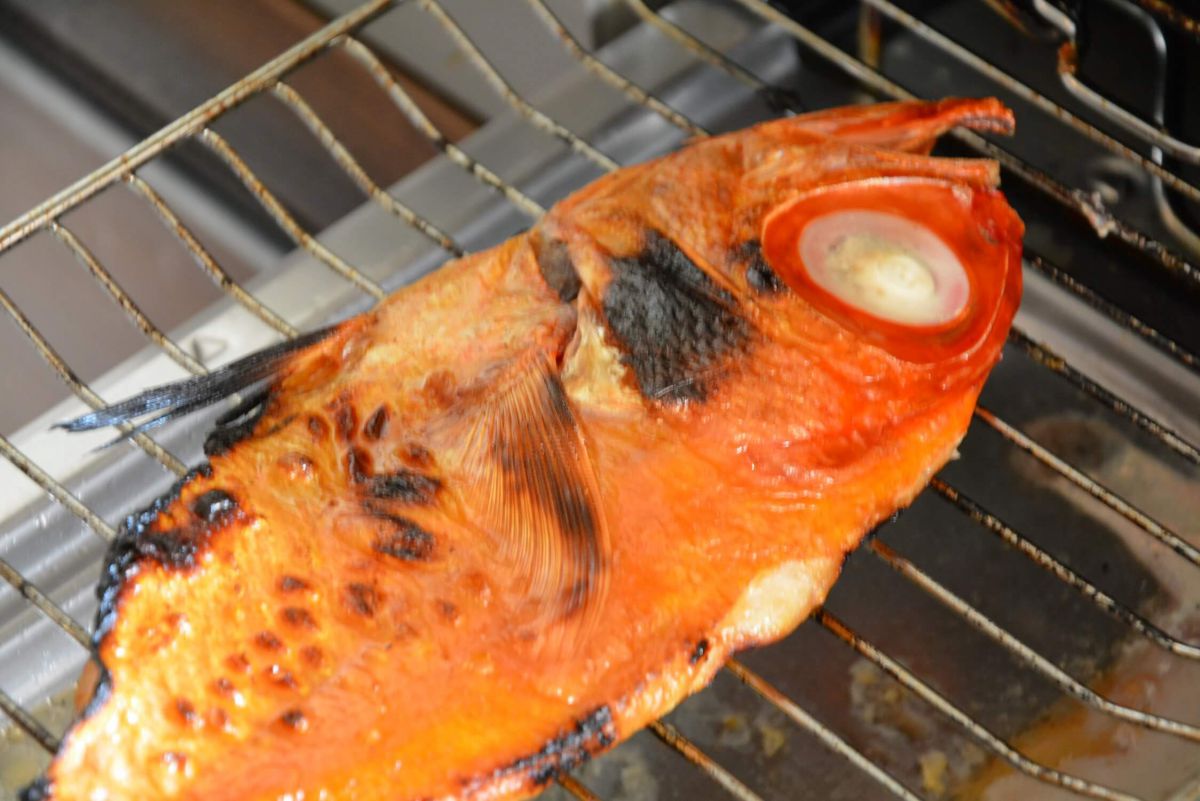事前にキンメダイの干物を焼いて、頭と骨と取り除いておきます。キャンプの際はぜひ炭火で焼きたいところ!