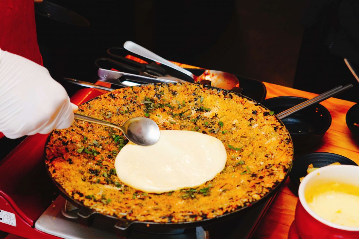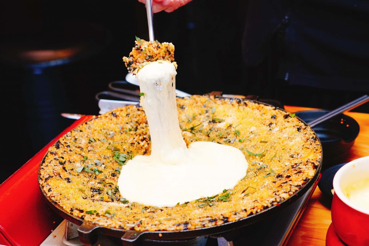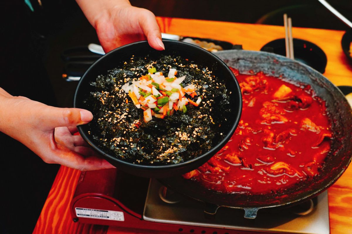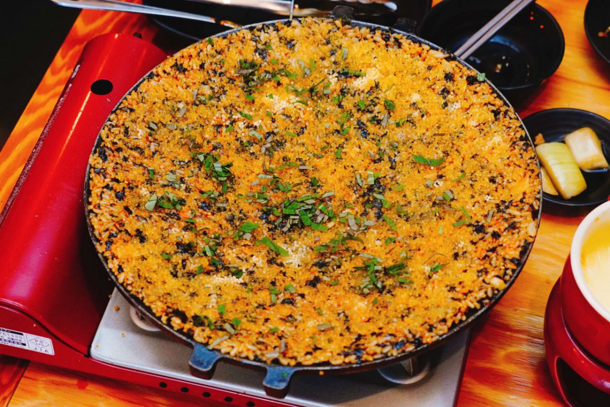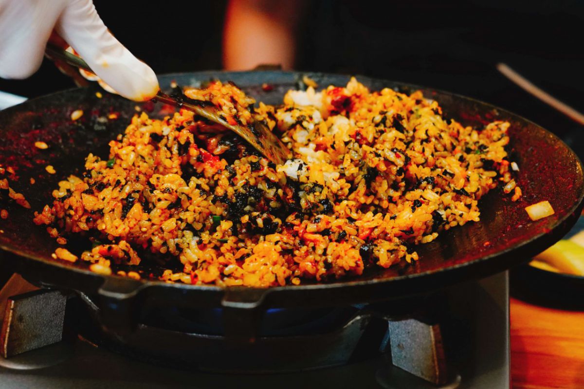 余った具材とソースの一部を別皿に避け、鉄板鍋に残したソースをグツグツ沸騰させたら、その上に「アルマニチャーハン」を豪快に投入!すぐさま韓国海苔とゴマを加えて混ぜ合わせます。すべてスタッフさんが目の前で調理してくれるので初心者でも安心して。