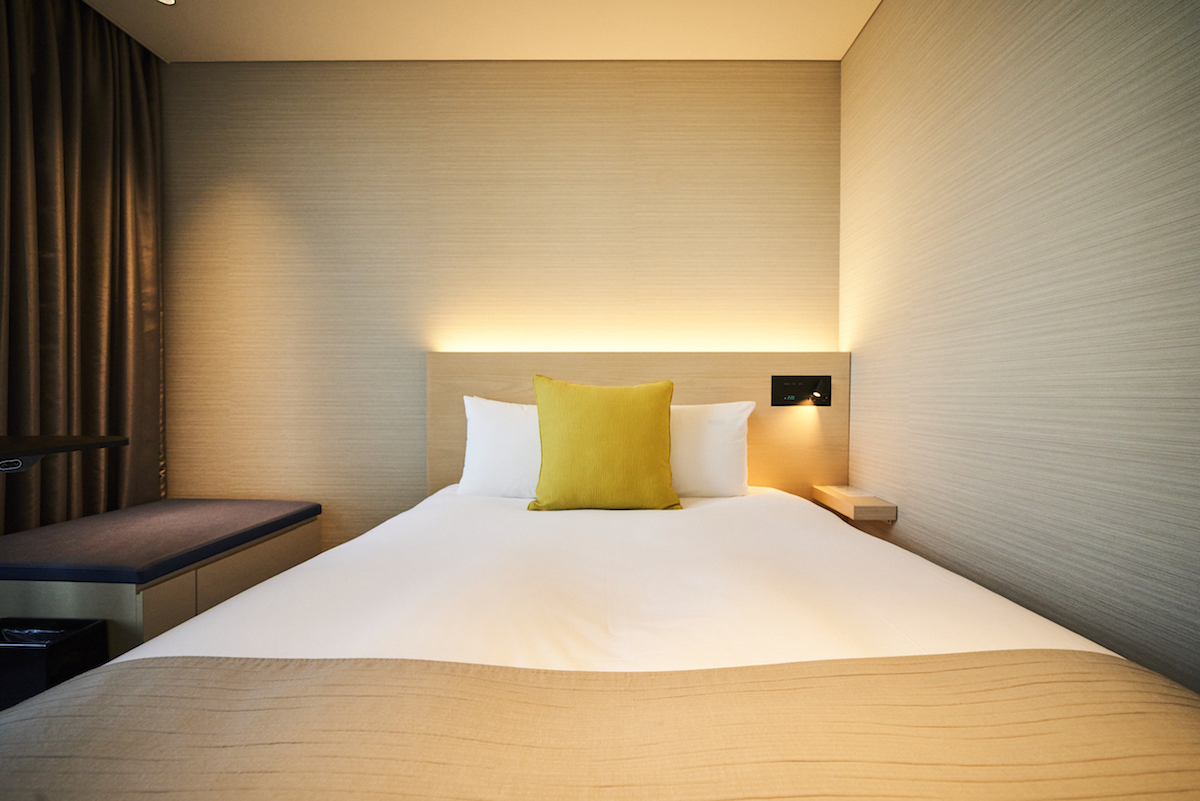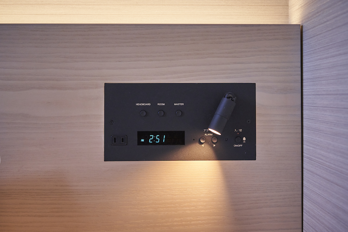 デスク周りが気になりつつも、まずは客室全体をチェック。広さ20㎡の客室「Modest」は各フロアに1室ずつあり、セミダブルベッドでおひとりさまにぴったり。シモンズ社製のマットレスは、寝返りにもフィットしてイスに座ってこわばった体をやさしく包んでくれます。休憩で寝落ちしないよう、ベッドサイドのアラームを活用しましょう。