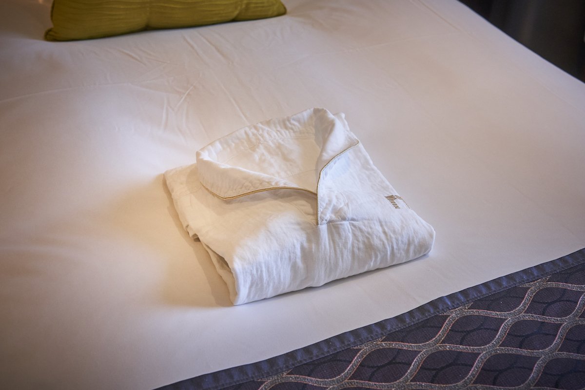 宿泊客の満足度を確実に上げているのが、こちらのナイトウエア。コットン100%・ダブルガーゼ素材のセパレートタイプなので、男女ともに快適に過ごせます。気に入って購入(7600円、フリーサイズ)する人も多いとか。