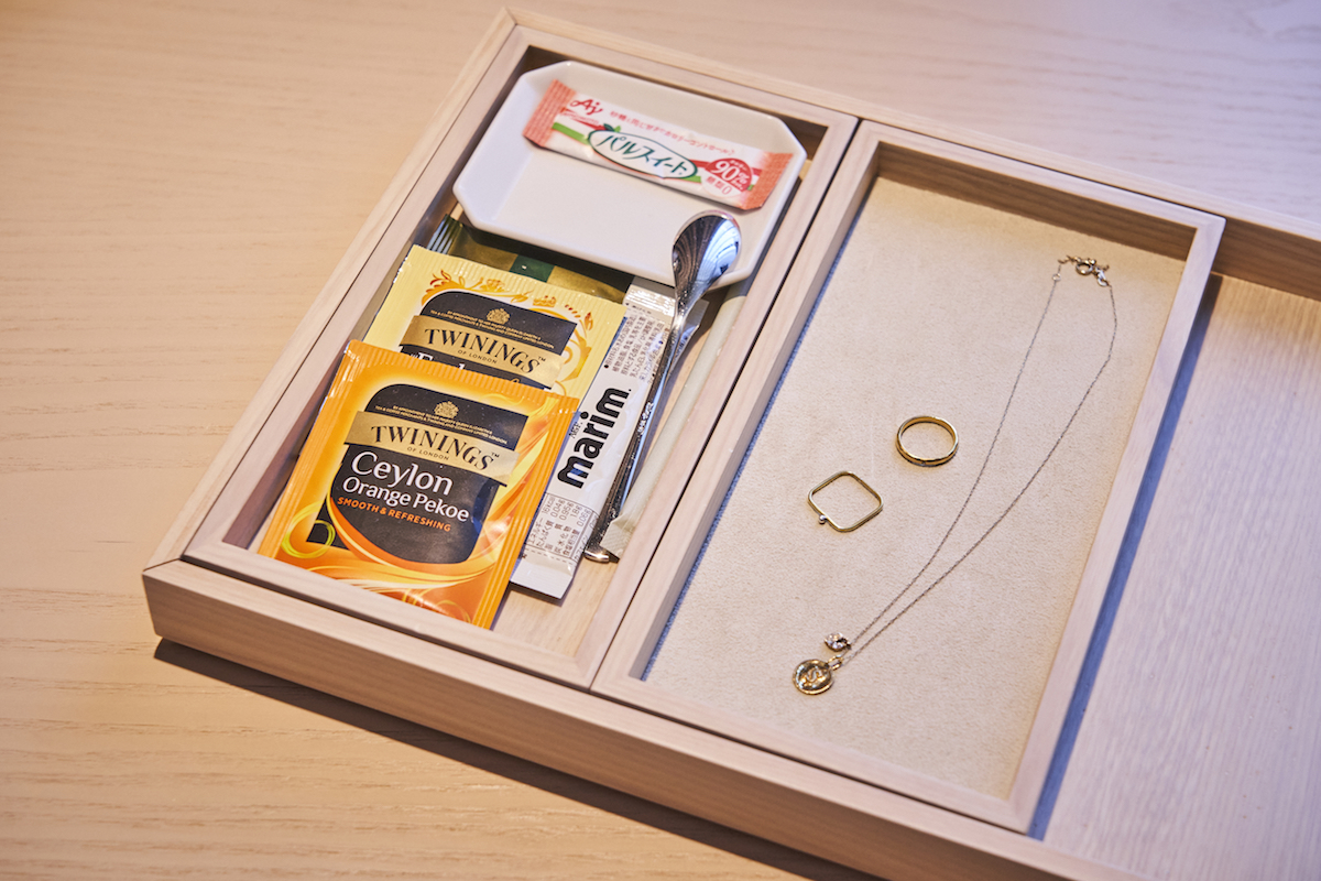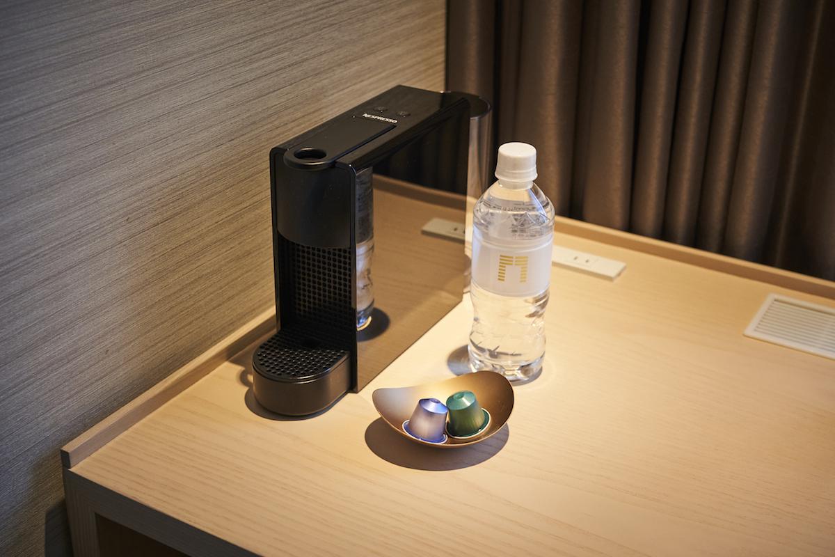客室での休憩には、ネスプレッソマシンで淹れるコーヒーや紅茶、日本茶をどうぞ。ミネラルウォーターで水分補給もお忘れなく。紅茶などのアメニティトレイには、アクセサリートレイも付いているので、仕事前にアクセサリーを外したらこちらへ。物の置き場があると、忘れ物が防げるので助かりますね。