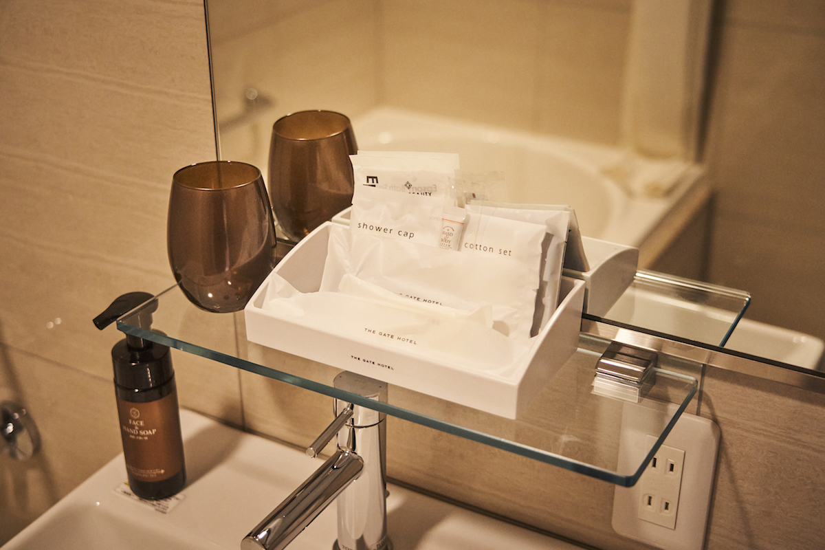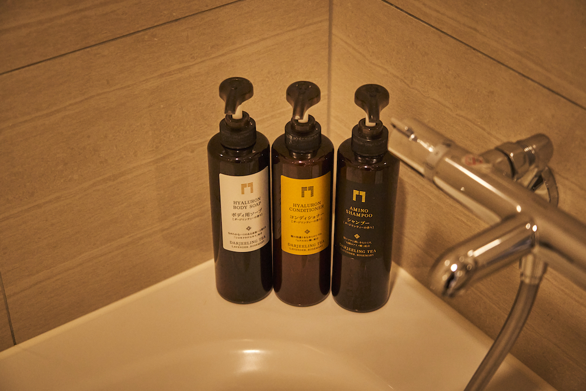 バスアメニティは、歯ブラシ、シャンプー&コンディショナー、ボディソープなど必要なアイテムがほぼ揃っているので安心です。なかでも注目は、ハンドソープ、ハンドクリーム、シャンプー類の香りが、紅茶のダージリンの香りで統一されていること。男女ともにいい香りと思える香りを採用したそう。