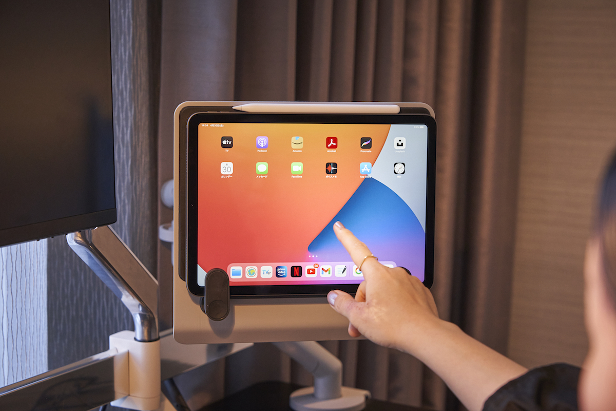 あると便利なのが、このタブレット用のスタンド。資料が全部この中にある、なんて場合には、目線の高さにタブレットがあると助かりますよね。PCモニターもタブレットも目線を下げることなく使えるので、肩こりが軽減される気がします。