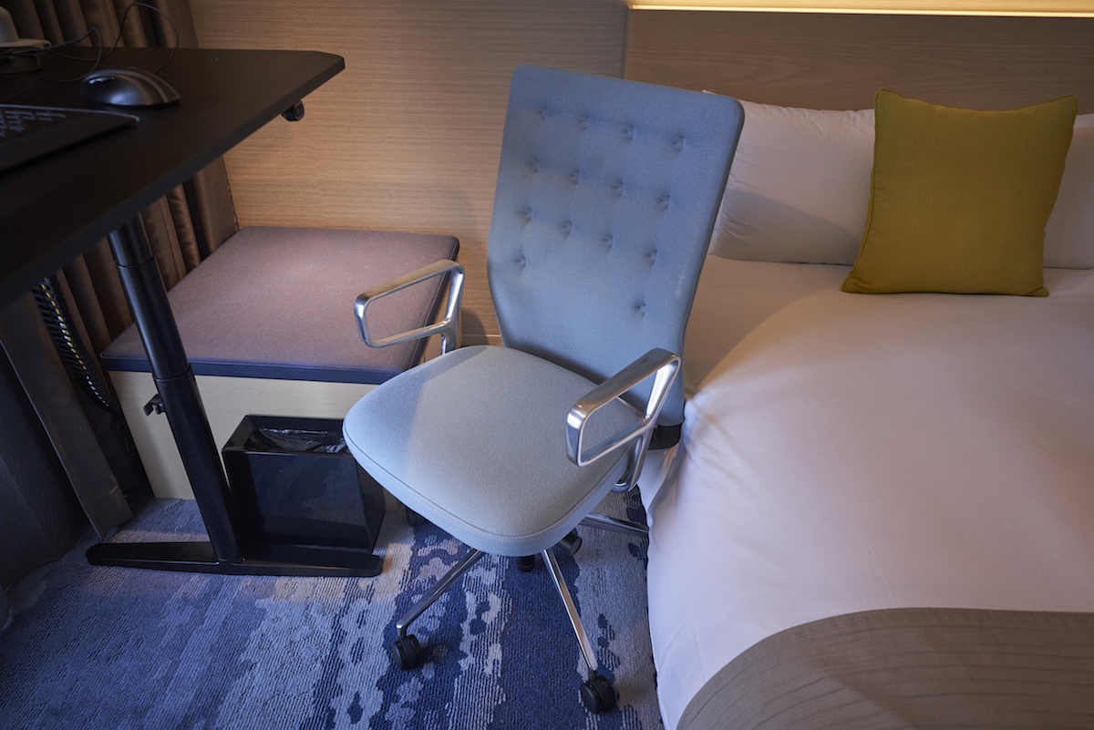 地下鉄銀座駅から徒歩1分というイージーアクセスで、迷うことなくホテルに到着。おひとりさまワーケーションということで、6タイプある客室から「Modest(モデスト)」をチョイス。入ってびっくり、まるでオフィスのようなデスクとイスが目に飛び込んできました!