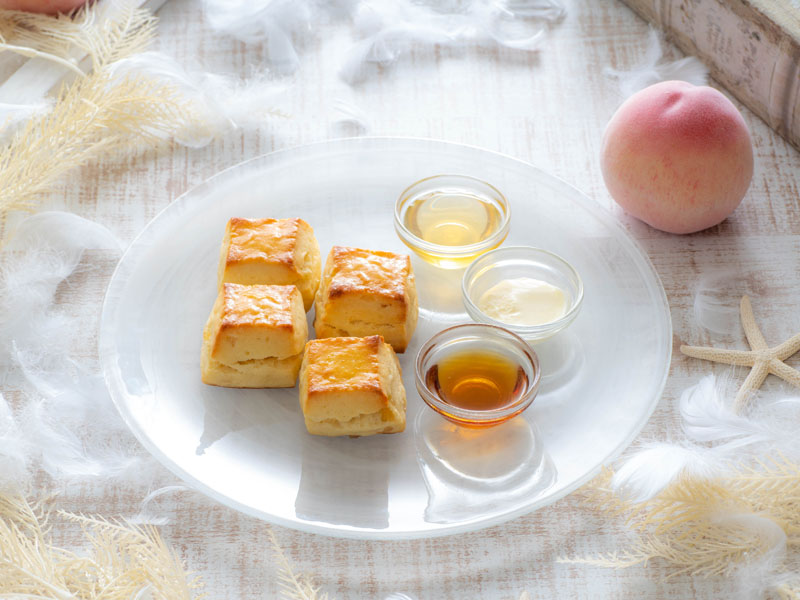 ラ・スイート直営のスイーツ&ベーカリー、「ル・パン」特製のスコーンにも、桃が練り込まれています。メープルシロップやはちみつ、クロテッドクリームを付けて、いろんな味の組み合わせを堪能しましょう。