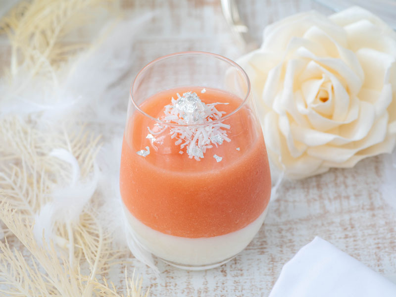 ドリンクでも桃を味わいたいなら、こちらの「フローズンピーチココ」付きでオーダーを。ジューシーな桃のスムージーと、ココナッツがほのかに香るゼリーで二層に仕上げ、ココナッツチップスと銀粉のトッピングで見た目も華やか!