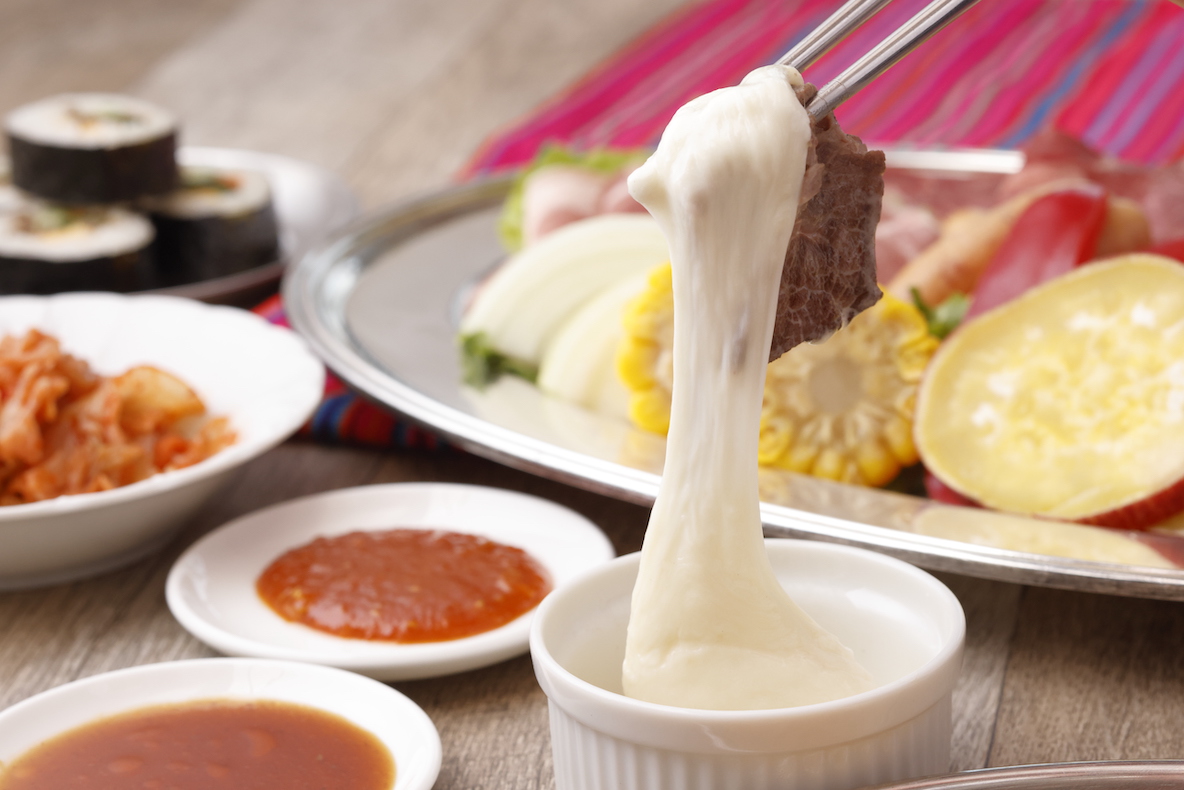 さらに、フードメニューにはチーズフォンデュのソースも用意されています。しっかり溶かしてお肉に絡めればチーズダッカルビ風に♪ また甘辛い味わいが特徴のサムジャンもあり、味変も楽しめます!前菜にはチョレギサラダ、ご飯ものならキンパもあって、食事メインでもしっかり満足できます。