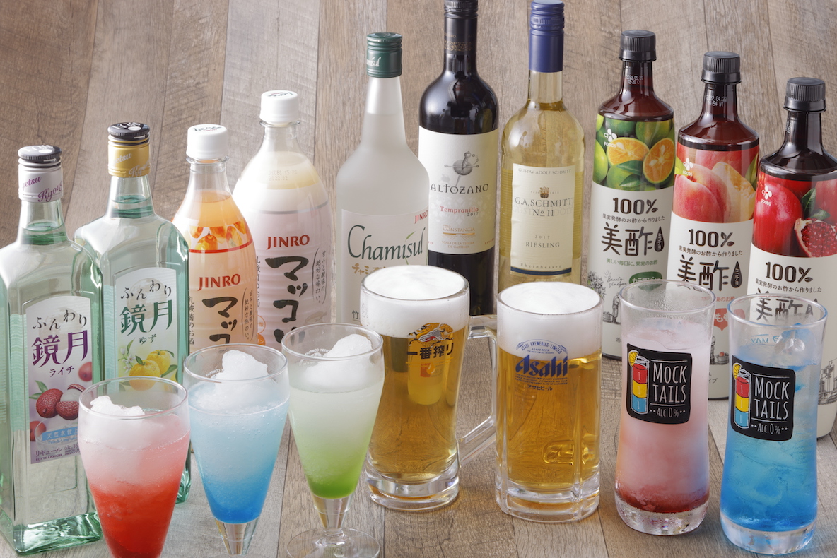 最長3時間30分も楽しめる飲み放題メニューは生ビールなら「アサヒスーパードライ」に「キリン一番搾り」。コリアンBBQらしく、優しい甘さの韓国焼酎「チャミスル」に、口当たりまろやかな「マッコリ」など、韓国のお酒ももちろん揃います。
