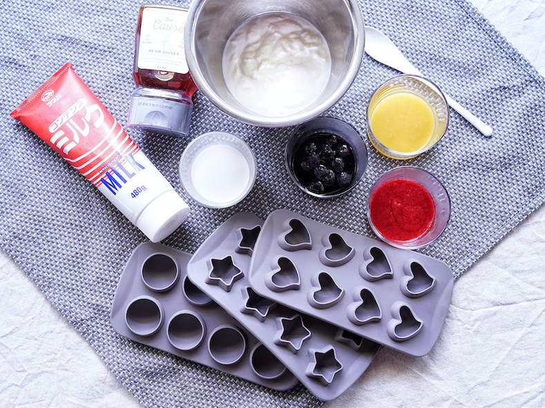 | ・ラズベリー、ブルーベリー、マンゴーなど市販のジャム…適量 ・無糖ヨーグルト…250g ・生クリーム…100g ・はちみつ…70g ・コンデンスミルク…30g |