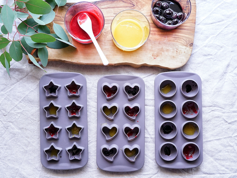 型にジャムやピューレをランダムに入れます。スプーンの背で、型にこすりつけるように塗るのがポイントです。