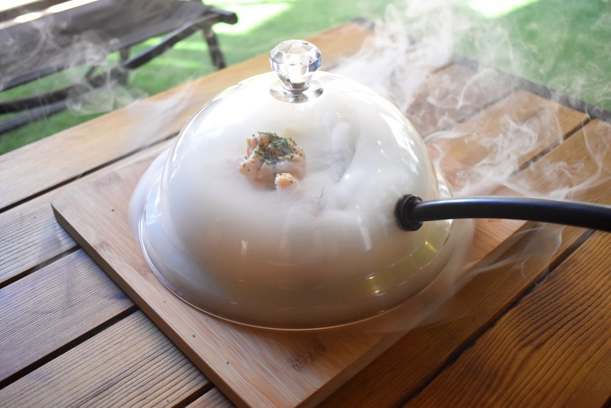 レシピ通り、約5分の香りづけを2回繰り返したら、おいしいスモーク料理のできあがり! ふたを開ける瞬間は、煙のなかから料理が現れてムービージェニックです。家族や友人といっしょに体験したら、盛り上がること間違いなしですよ。
