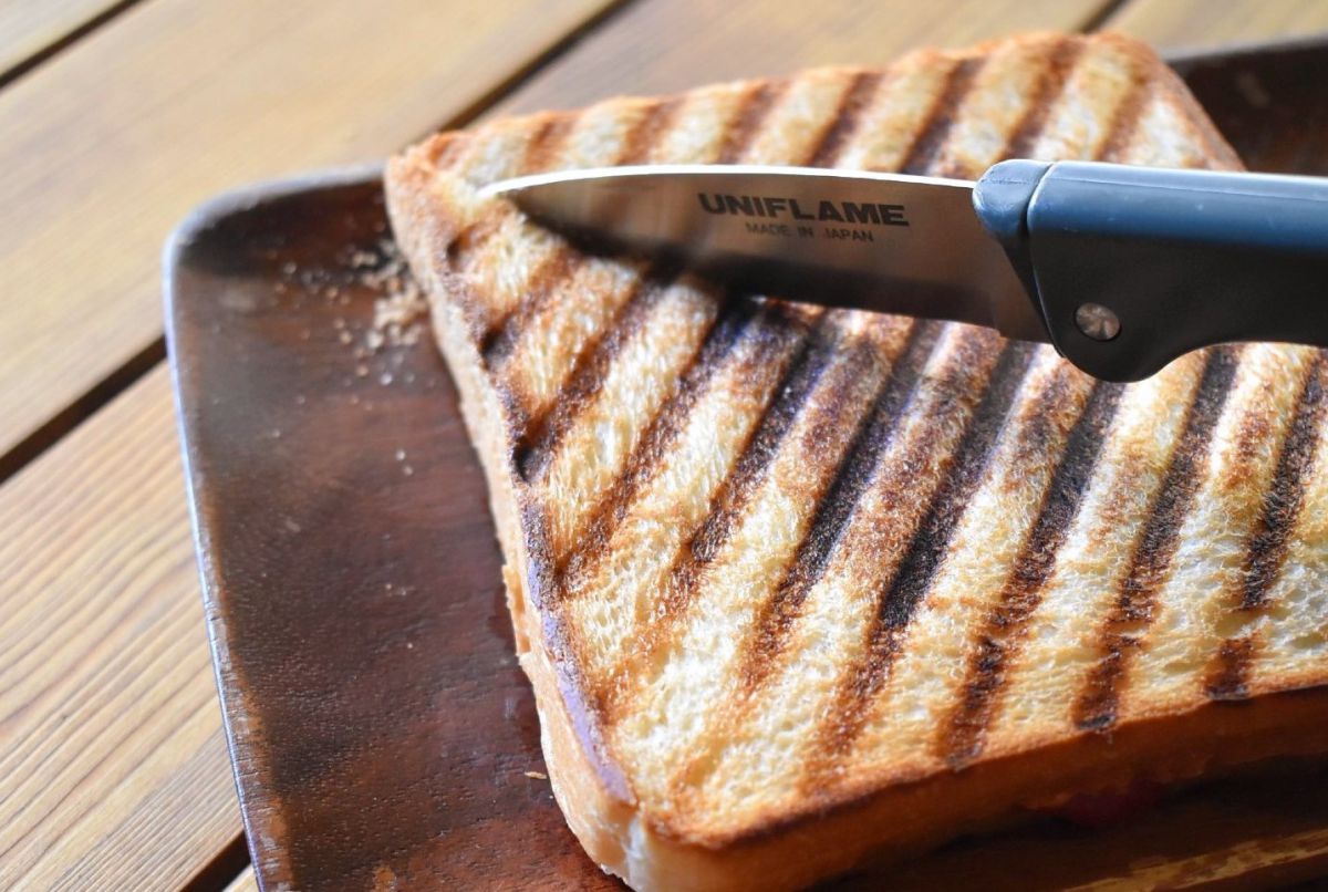 ホットサンドを切るために用意されているのは、本格的なサバイバルナイフ。細かいところまできちんとアウトドアグッズが使われているので、とことんキャンプ気分が味わえますよ。