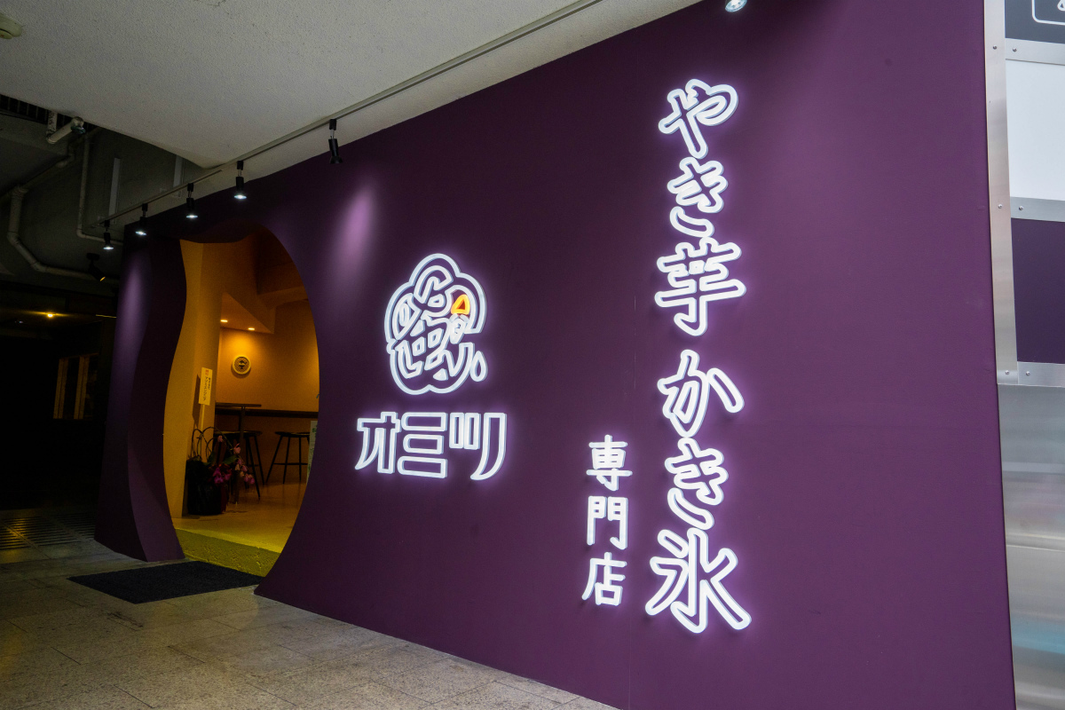「やき芋かき氷専門店 オミツ」があるのは、大阪・心斎橋のアメリカ村エリア。特徴的な紫色の外観、店名のネオン、蜜をイメージした入口が目印です。同店の前身である人気かき氷店「ヤドカリ」を経て、オープンさせました。