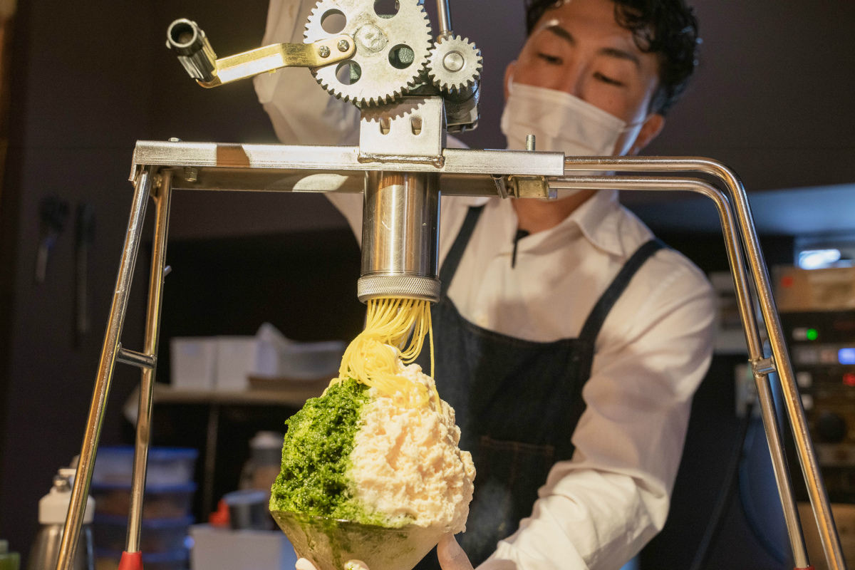 今回オーダーしたのは「やき芋と宇治抹茶ミルク」1100円。焼き芋とミルクと抹茶のハーモニーが楽しめる、同店人気のメニューです。使用する氷は、時間をかけて凍らせた純氷。ふわっととろける食感に仕上げるため、削り方を調節しながら器に盛っていきます。