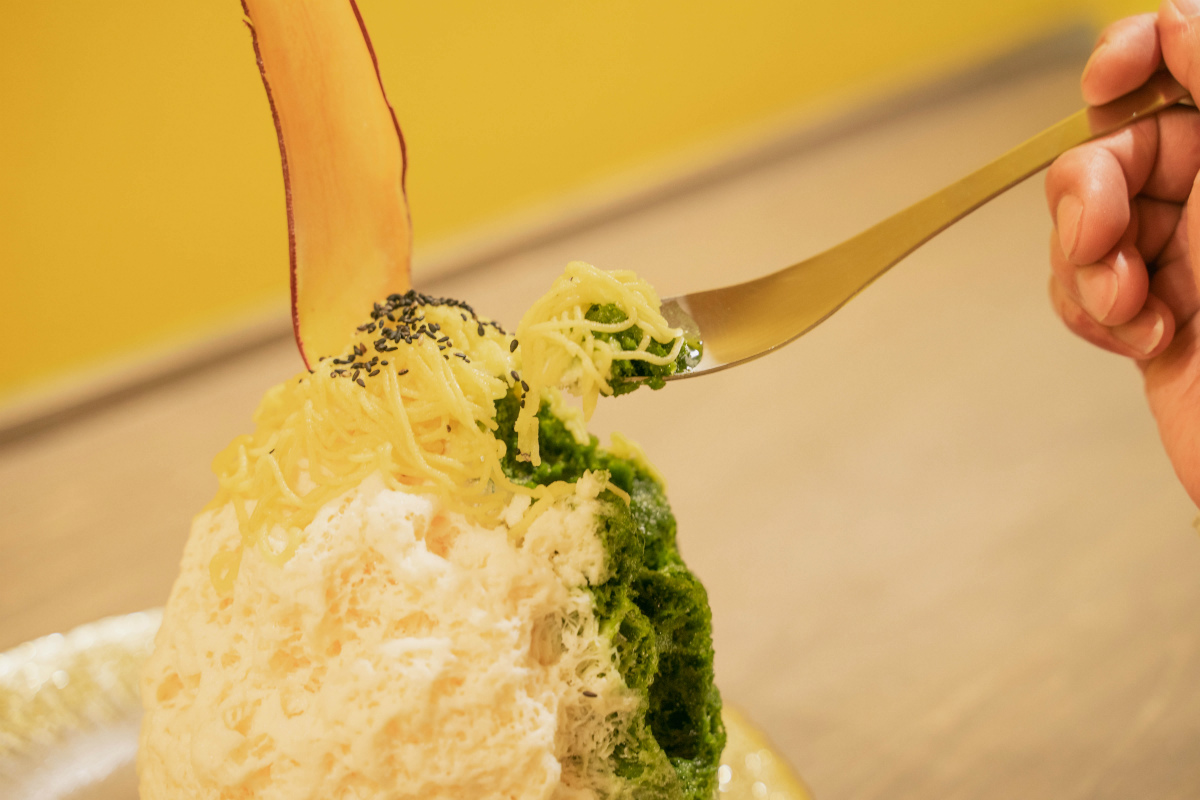 向かって左半分にエバミルクのシロップ、右半分に京都の宇治抹茶シロップがかかり、中には焼き芋と発酵バターエスプーマを忍ばせています。さらには焼き芋ペーストと芋チップのトッピングで、食感と味わいのバリエーションが楽しめます。