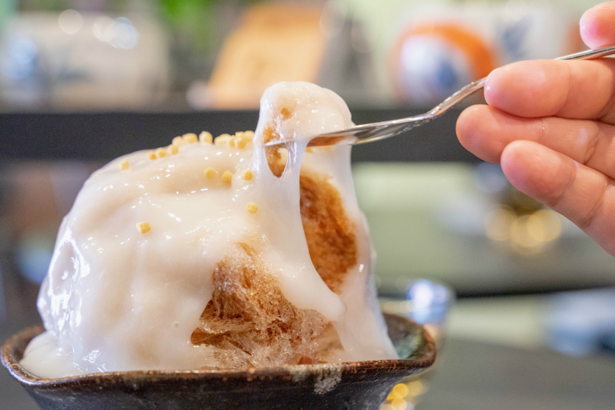 口に入れると、シャクシャクねっとりの幸せなハーモニーが楽しめます。シンプルなかき氷もすっきりとして抜群ですが、濃厚さを味わいたいなら信玄餅やクリームチーズをトッピングするのもおすすめ!