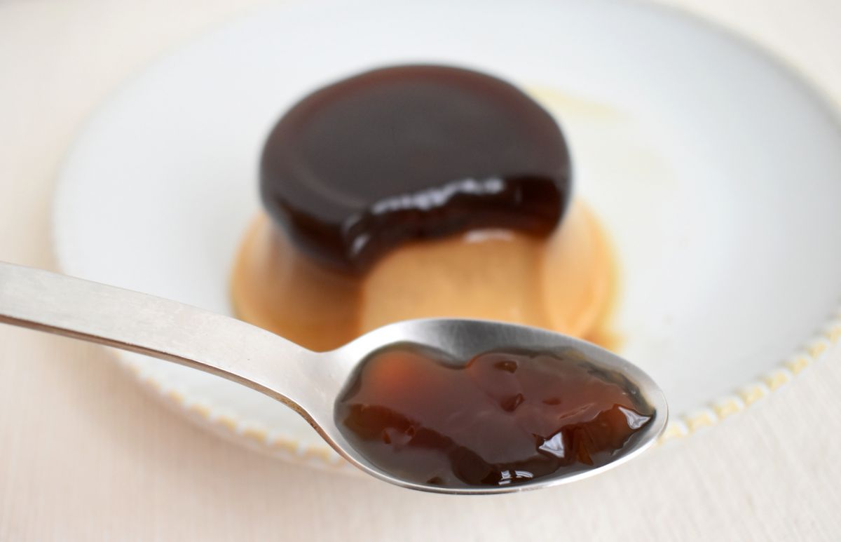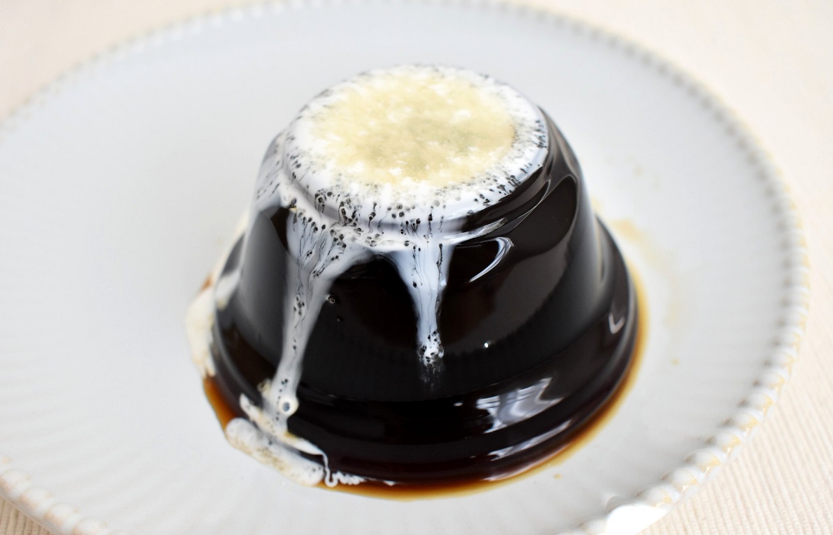 カルディの「ベトナム風練乳プリン」は、しっかりかための練乳プリンと、プルプルやわらかいコーヒージュレの2層仕立て。カップから出してみると、コーヒージュレの部分がこんもりとしていて、独特な形をしています。