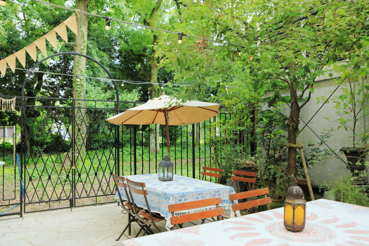 店の奥には、オープンエアーで開放感あふれるテラスも。隣接する靭公園の緑が近く、爽快感たっぷりです。屋根があるので、雨の日でも快適。テラスのみ、ペットの同伴も可能です。