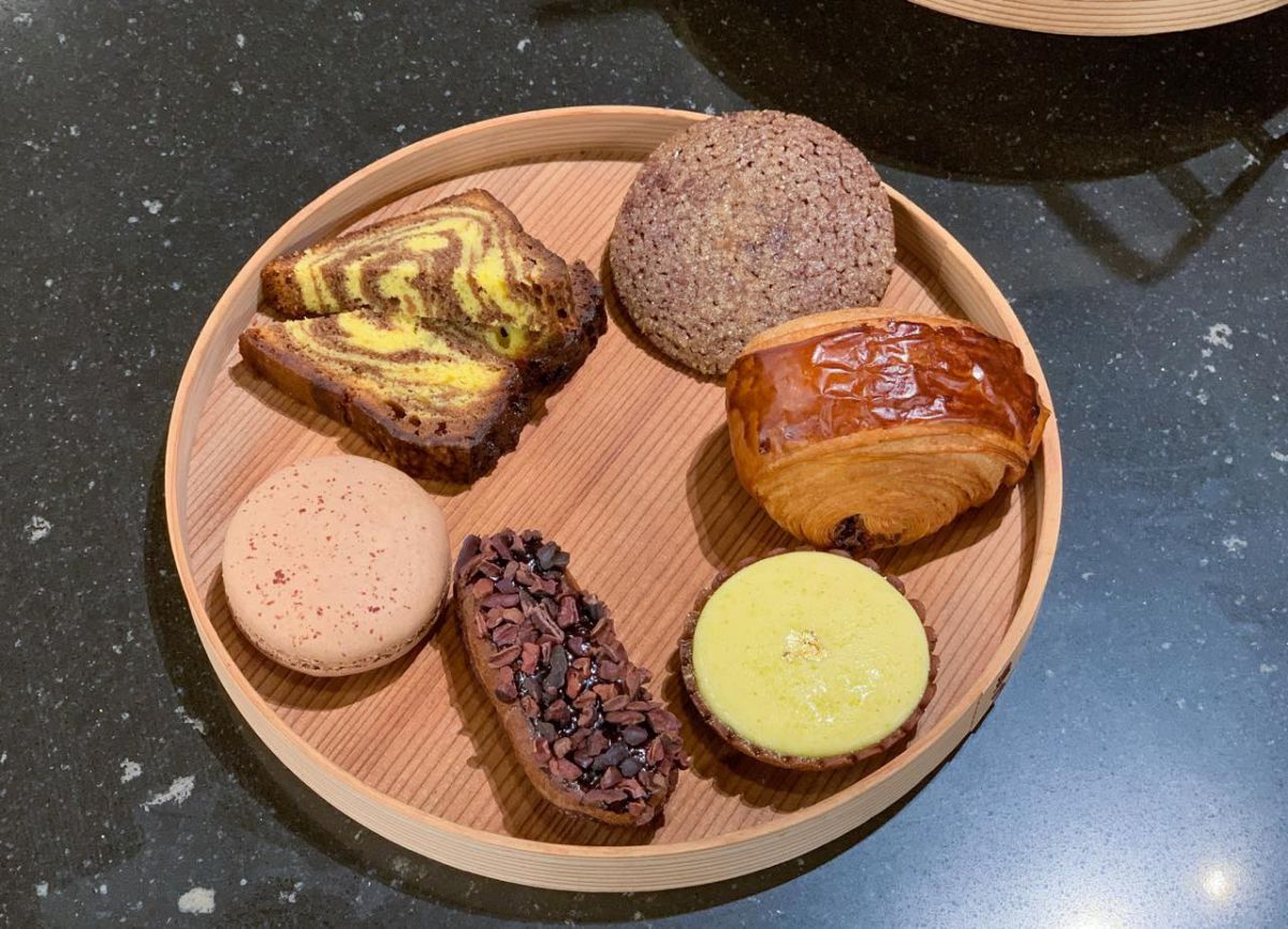 時計回りに、ケーク・マルブレ、サブレ・ディアマン、パン・トゥ・ショコラ、タルトレット・シトロン / プラリネ、キャロリーヌ・ショコラ / キャラメル、マカロン・ショコラ / フランボワーズ。どれからいただくのか迷いますね。