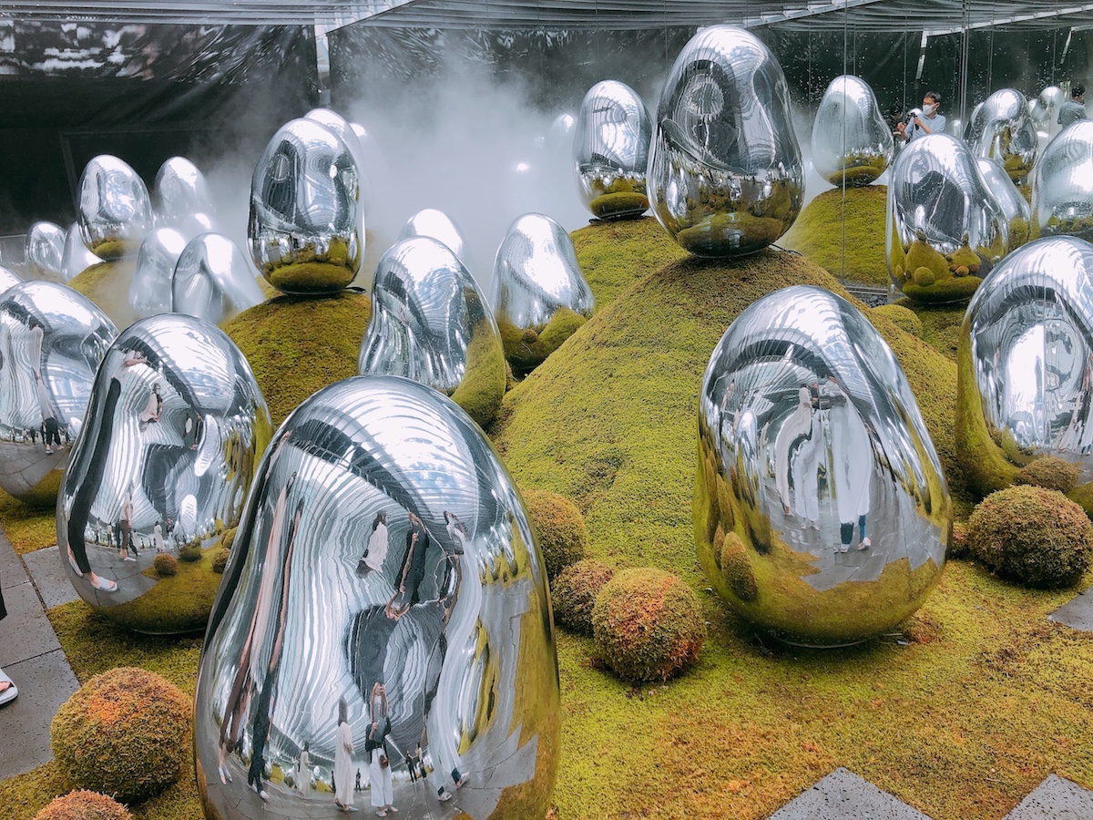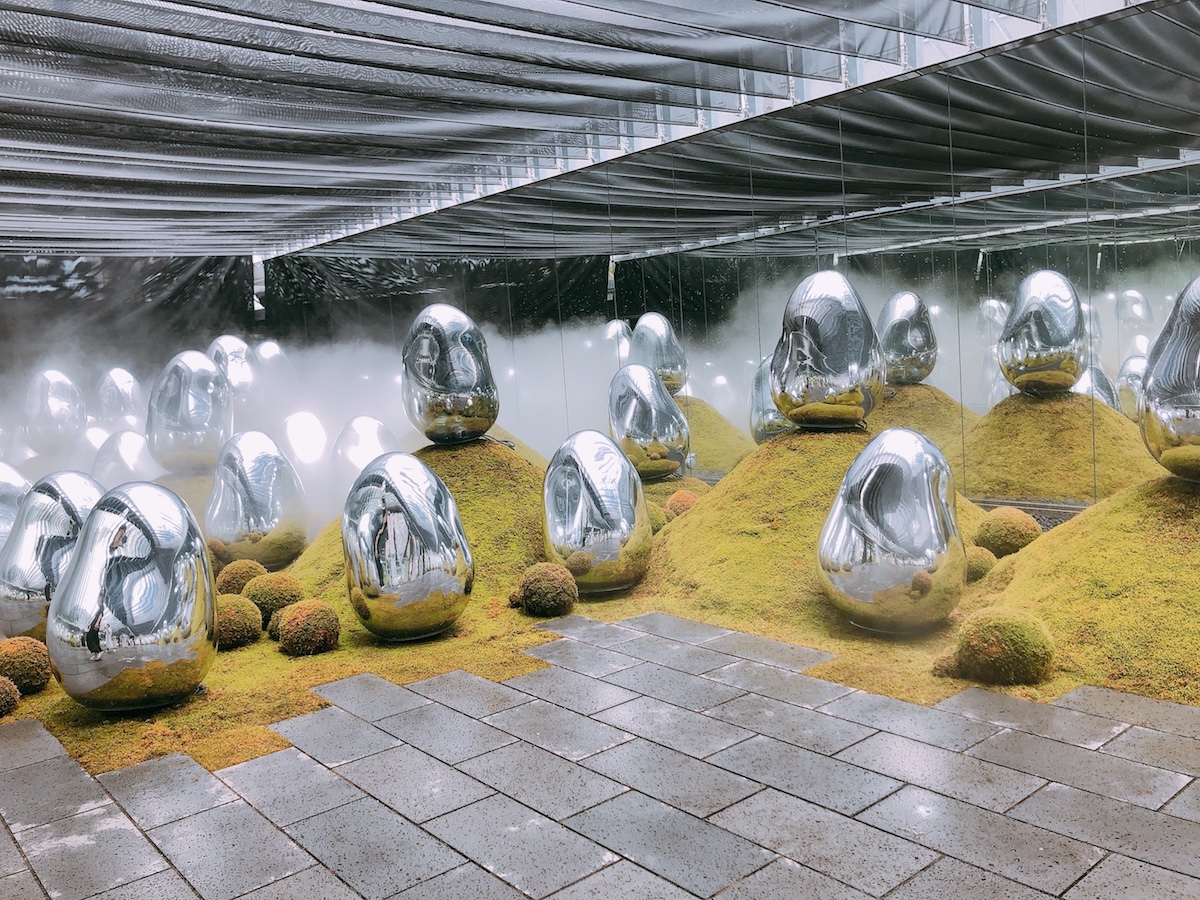 2つ目の庭園は「呼応する小宇宙の苔庭 - 固形化された光の色, Sunrise and Sunset」。本物の苔の上に、卵型体を意味する「ovoid」が無数に並べられています。