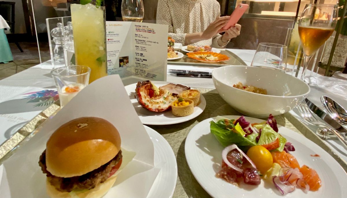 じゃーん!アヒポキ、ロミサーモン、ハワイアンピラフ、ハワイアンバーガーなどハワイを感じるメニューをたくさんとってきました。2回目には、カハラロコモコやリリコイ&グアバチキンローストなど、ハワイのカハラホテルで出されている代表的な料理もいただきましたよ。ローストビーフなどの人気メニューは、ライブキッチンで提供されます。私は特に、マグロやサーモン、オマールエビなど、シーフード料理がとっても美味しくて感動しました!