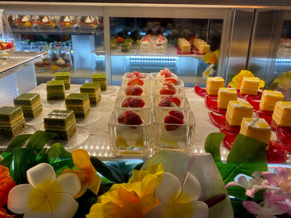 別腹で食後のスイーツもお忘れなく。ミニケーキは種類豊富で、何個でも食べられそうです。ハワイを代表するおやつ・マラサダは、実はハワイで食べたことがなくて今回初めていただきました!砂糖がたっぷり、でも中はさっくり重くないので、とても食べやすいことにびっくり!また、シンパンケーキはクレープのような薄い生地をくるくる巻いてメイプルシロップと絡めた「ザ・カハラ」の名物デザート。バニラアイスも添えられて、とっても美味でした。