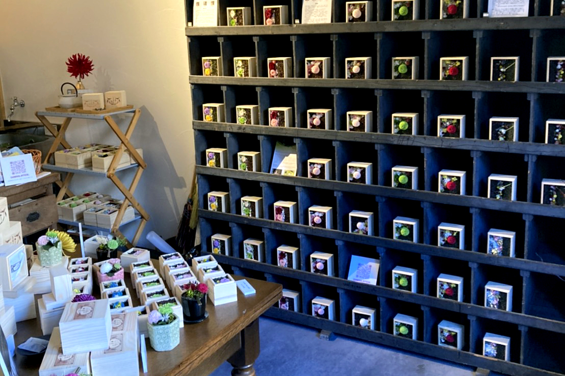 特製キットは、本物の植物を使ったプリザーブドフラワーやドライフラワーをはじめ、煎茶と焙じ茶の茶葉、木箱やギフト用の紙袋など盛りだくさんの内容。