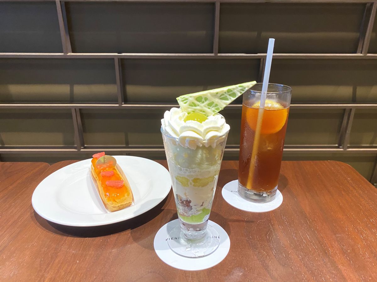 本日いただいたのはこちらの3品。左から」「マルコリーニ エクレア グレープフルーツ」、「マルコリーニ メロンパフェ」、「クラフトカカオコーラ」です。早速実食レポートしていきます!