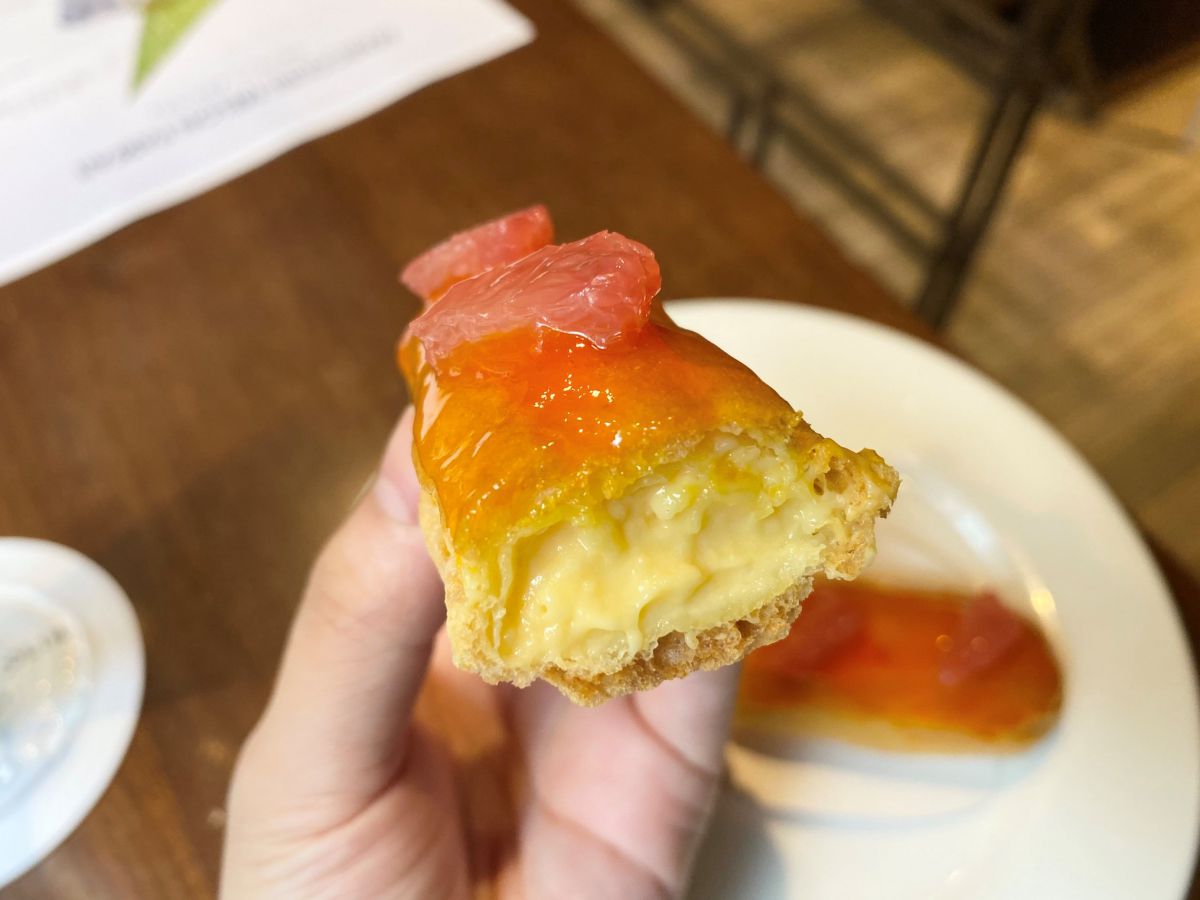 エクレアの上にはグレープフルーツのほろ苦さを際立たせたグラサージュとグレープフルーツの果肉をトッピング。グレープフルーツのエクレアって珍しさを感じますが、これが相性抜群なのです。