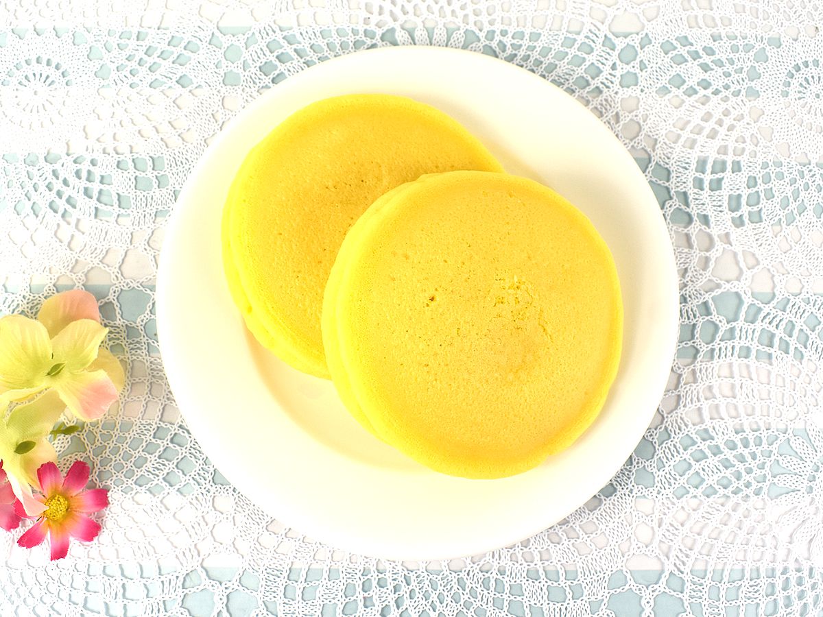 パッケージを開けると優しい黄色のパンケーキが2つ登場。ほんのりと甘い香りが漂って、ついつい頬が緩んでしまいました。