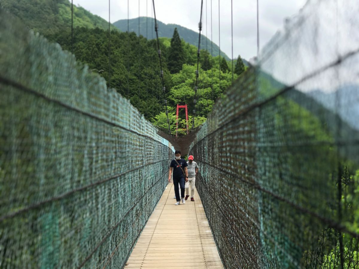 面不動鍾乳洞からは山の中を歩く自然遊歩道を進みます。10分ほど歩くと、向かいの大原山へと渡る「かりがね橋」という吊り橋が登場。高さ約50m、全長約120mあり、天川村では一番長い橋です。眼下に広がる洞川の街を望みながらの空中散歩が楽しめます。この橋を渡って大原山を下り、洞川の名水「ごろごろ水」が湧く場所を目指します。
