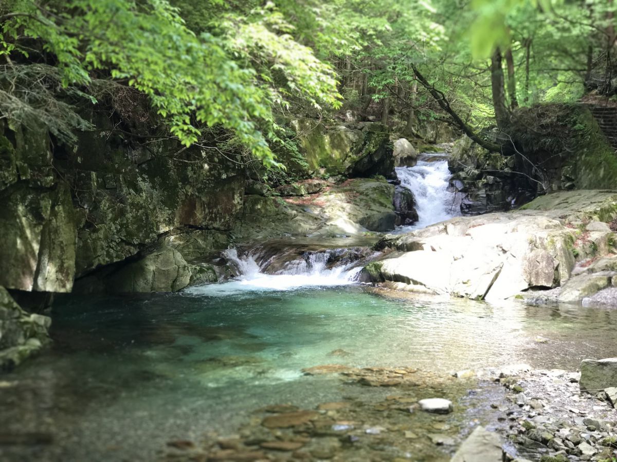 山上川に降り遊歩道を進めば、滝つぼがエメラルド色に輝く名勝「河鹿の滝(かじかのたき)」が姿を現わします。二段で落ちる滝が景色に奥行きを作り、スケールは小さいながらもいつまでも見続けてしまう絵のような滝です。清流の歌姫とも称されるカジカガエルが名前の由来で、美しい鳴き声をBGMに鑑賞できる夏こそ訪れてみたいですね。